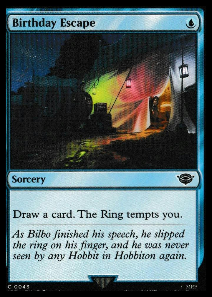 Universes Beyond: The Lord of the Rings: Tales of Middle-earth #43 Birthday Escape . Lightly played Other important information about this card: Common2023 Birthday Escape played for the .Please check out our other listings for more great cards.
